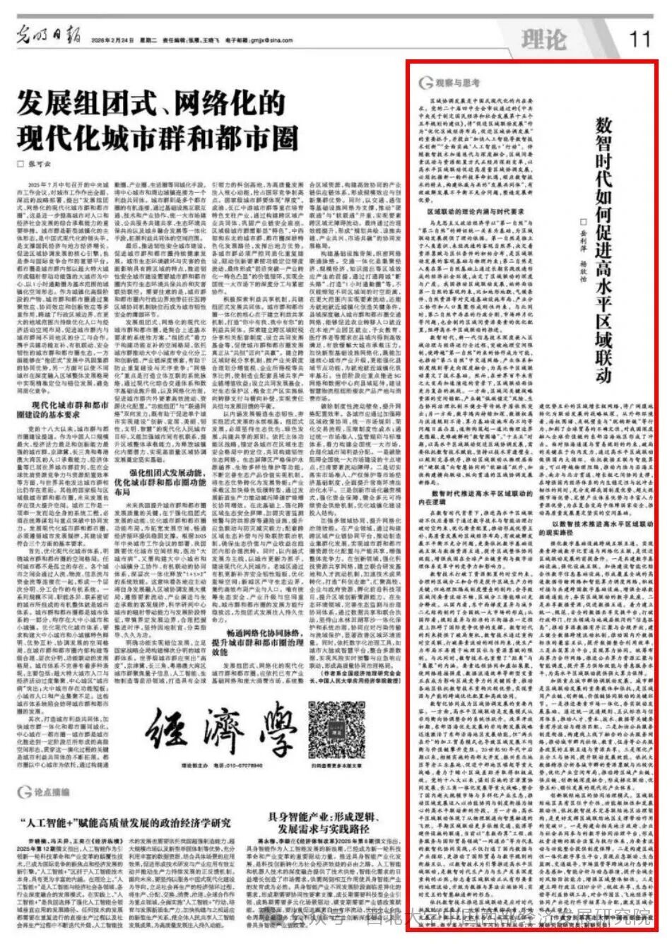 我院岳利萍教授团队论文发表在《光明日报》 2026-04-07 2026年2月24日,《光明日报》刊发我院岳利萍教授和博士生杨欣怡合作撰写的理论文章《数智时代如何促进高水平区域联动》。该文以马克思主义政治经济学为理论基础,剖析了数智时代以高水平区域联动促进高质量区域协调发展的内在逻辑与现实路径,深刻阐释党的二十届四中全会精神。 文章指出,马克思主义政治经济学以“第一自然”与“第二自然”的辩证统一关系为基础,为区域联动发展提供了理论依据。传统的区域协调发展长期受制于“第一自然”的刚性约束和“第二自然”的制度障碍。进入数智时代,人工智能等技术的深度渗透不仅打破了资源配置的时空局限,使生产力布局不再受制于地理区位,更通过“东数西算”“一网通办”等实践,推动区域联动从物理层面的“硬联通”转向智慧协同的“软融通”。为实现这一目标,未来需强化数字基础设施的跨域互联,以城市群为载体深化要素市场一体化和产业协同,并创新联结地区的数字治理模式,通过构建区域性数字孪生平台及利益协调机制,最终形成休戚与共的“发展共同体”,在复杂变局中筑牢国家安全与高质量发展的空间基石。 该文不仅为新一轮科技革命背景下破解地理阻隔与制度壁垒、依托数智技术推动高水平区域联动提供了重要启示,更为破解发展不平衡不充分问题、优化重大生产力布局提供了有益参考。 下一条:中国西部经济发展研究院召开干部宣布会议 / 打印 / / 关闭 /